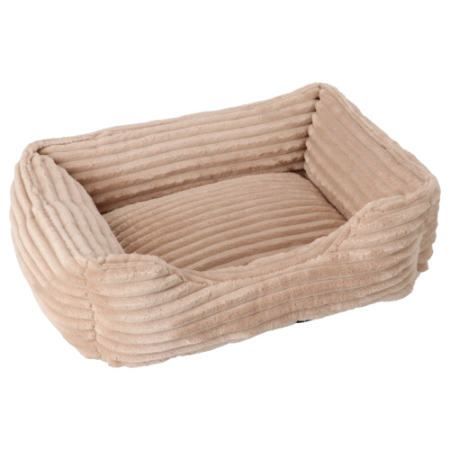 Zachte kattenmand Saar Taupe met een lage instap en antislip nopjes aan de onderkant. Stevig ontwerp met afmetingen 50x40x17 cm, ideaal voor katten die graag een gemakkelijke, stabiele rustplek zoeken. Kleur Taupe.